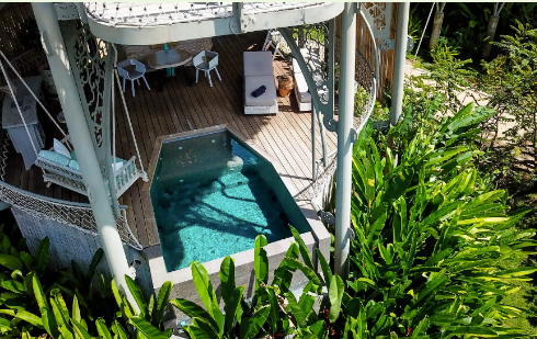 下层拥有独立的露天泳池,配备恒温系统,适合全天候畅游。周围环绕沙发秋千、吊床及日光浴床,打造悠闲的休憩区。