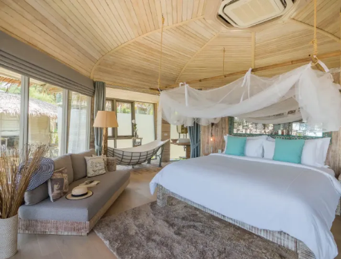 上层设有一张特大号豪华床铺,搭配全景落地窗,可直接欣赏无边海景与苍翠山峦。浴室采用吊床形设计,配备悬浮浴缸、独立淋浴区及双人洗手台,营造浪漫的沐浴体验。