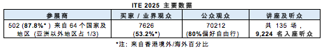 ITE的买家及业界观众中,约 30% 来自中国内地,另有逾 20% 来自亚洲其他地区。参观者包括个别业界人士及来自广东多个城市旅游行业协会组织的代表团。